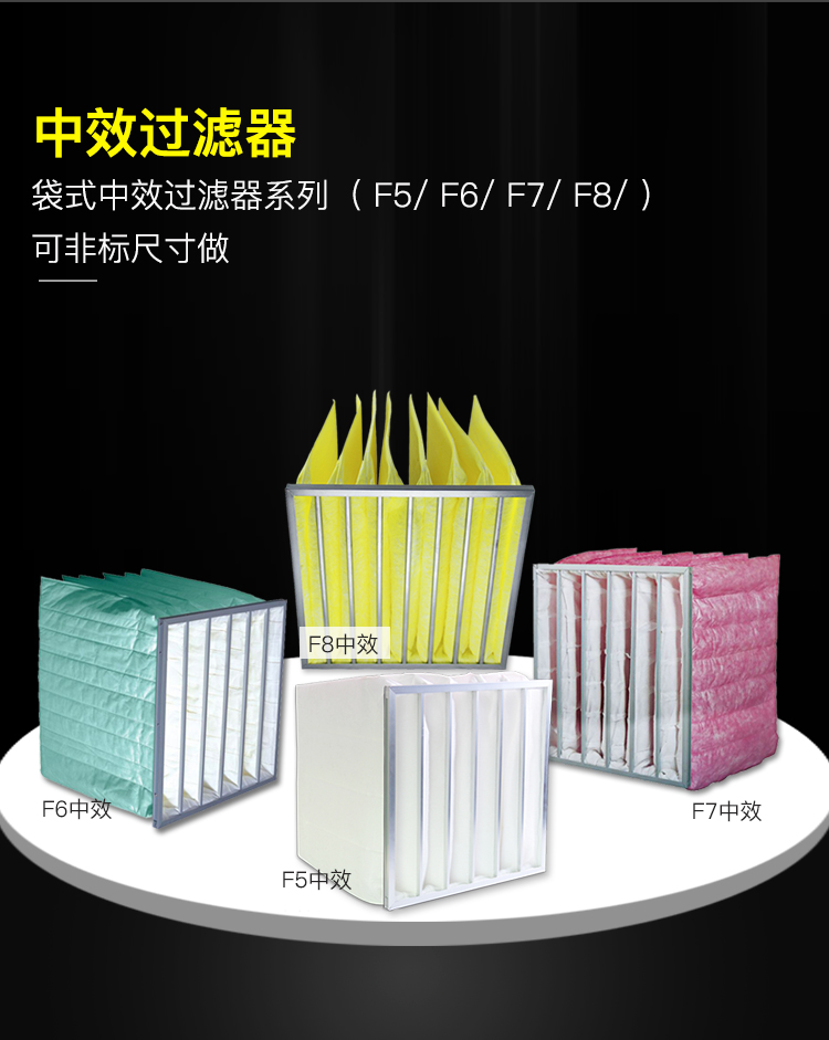 中效袋式過濾器(又稱袋式中效過濾器或者袋式中效空氣過濾器),主要適用于空調(diào)系統(tǒng)的中級過濾,位于高效過濾器的前端,用于過濾1-5um的塵埃粒子,以保護(hù)系統(tǒng)中下一級過濾器和系統(tǒng)本身。具有阻力小、風(fēng)量大的優(yōu)點(diǎn)??蛇x樣式有袋式、框式、組合式等。中效袋式過濾器|袋式中效過濾器一般采用無紡布、進(jìn)口玻璃纖維作為濾料,加以鍍鋅板或是鋁合金外框。具有容塵量大、風(fēng)量大、阻力小,可重復(fù)清洗的優(yōu)點(diǎn)。廣泛應(yīng)用于光學(xué)電子、儀器儀表、食品飲料、生物實(shí)驗(yàn)室等行業(yè)里;中效袋式過濾器|袋式中效過濾器特點(diǎn):中效袋式過濾器采用超細(xì)合成纖維以特殊工藝制成,避免舊式玻璃纖維材料可能對人體造成的危害,濾料內(nèi)含有防靜電纖維,對空氣塵埃顆粒過濾特別好,具有過濾面積大、吐氣性高、使用壽命長等特點(diǎn)。1.采用超細(xì)化纖纖維濾料,容塵量大、使用周期內(nèi)效率穩(wěn)定。