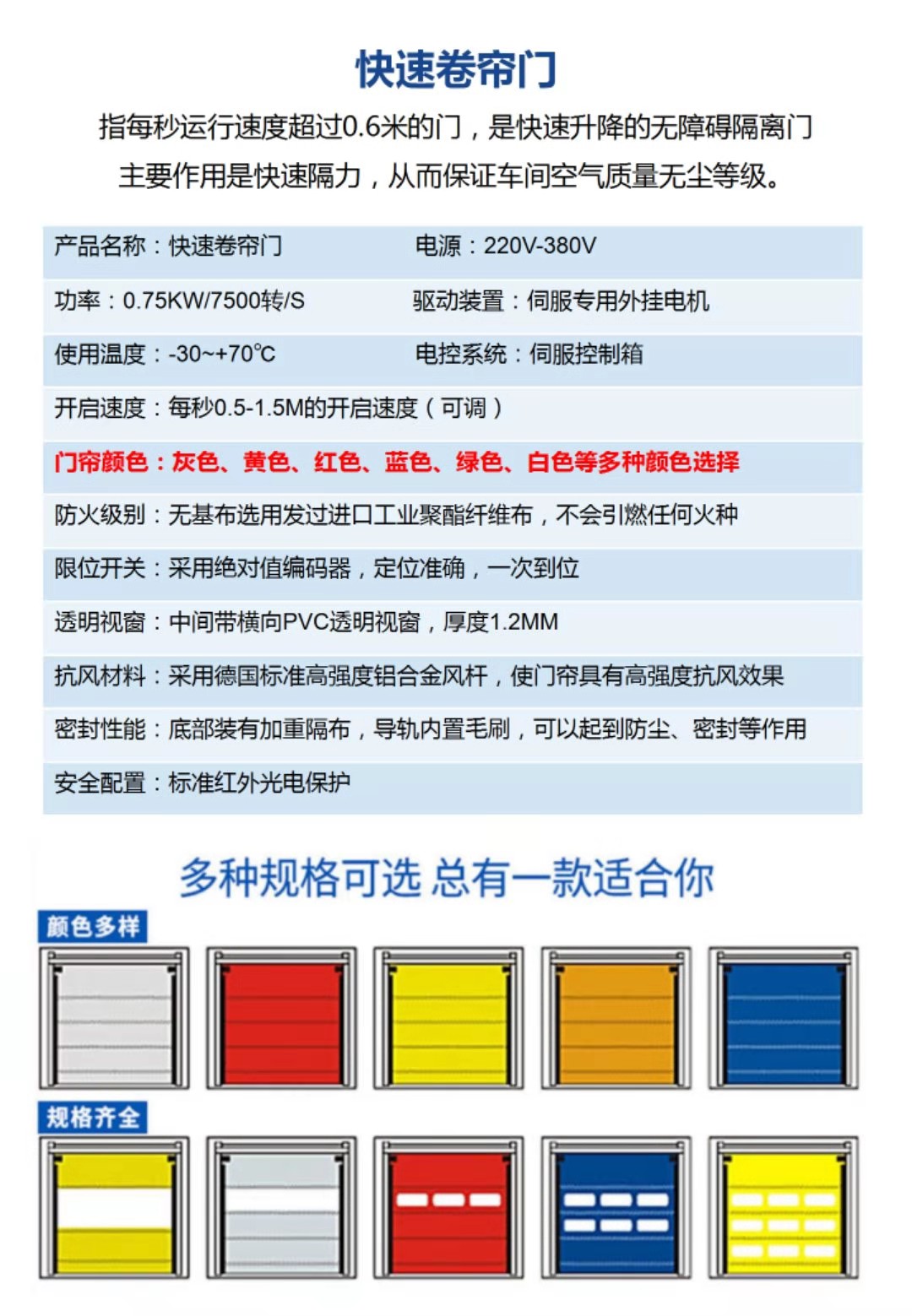 D、PVC門簾材料:進(jìn)口高密度聚脂纖維表面鍍膜處理,厚度0.8mm-1.5mm,顏色可選擇。