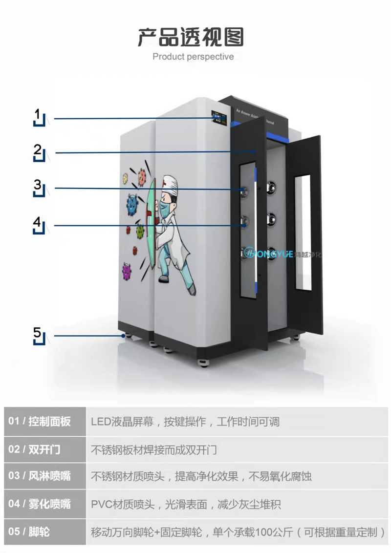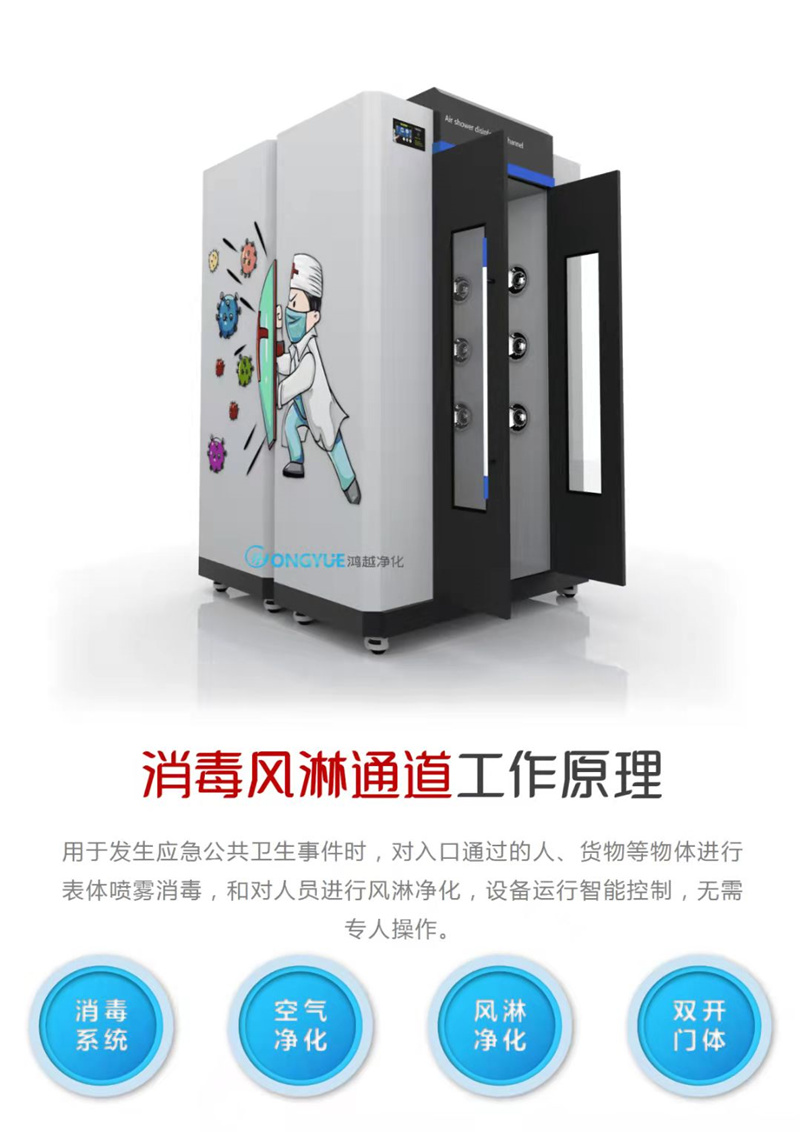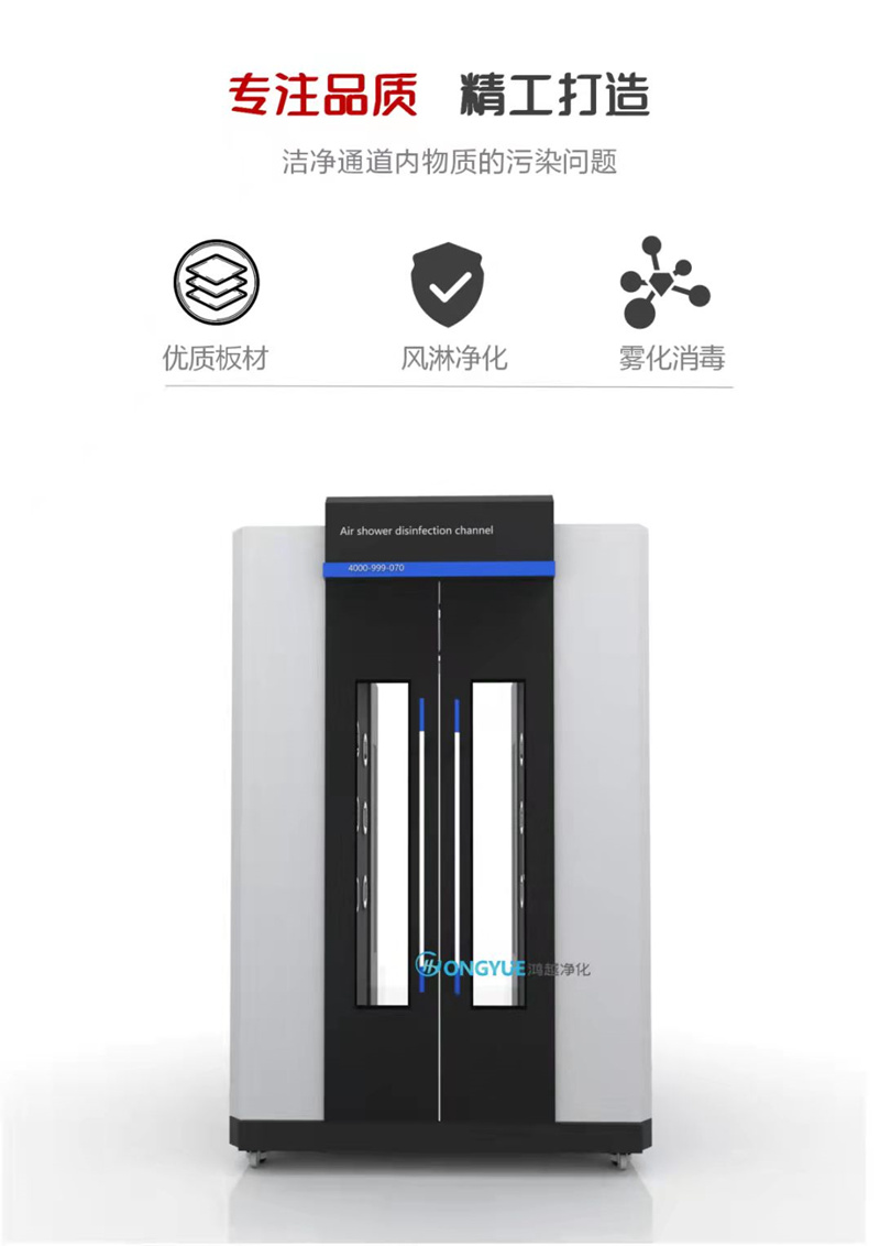 4、風淋系統(tǒng):風淋將人或物體表面的塵埃吹落,通過空氣過濾器內(nèi)部循環(huán)凈化;
