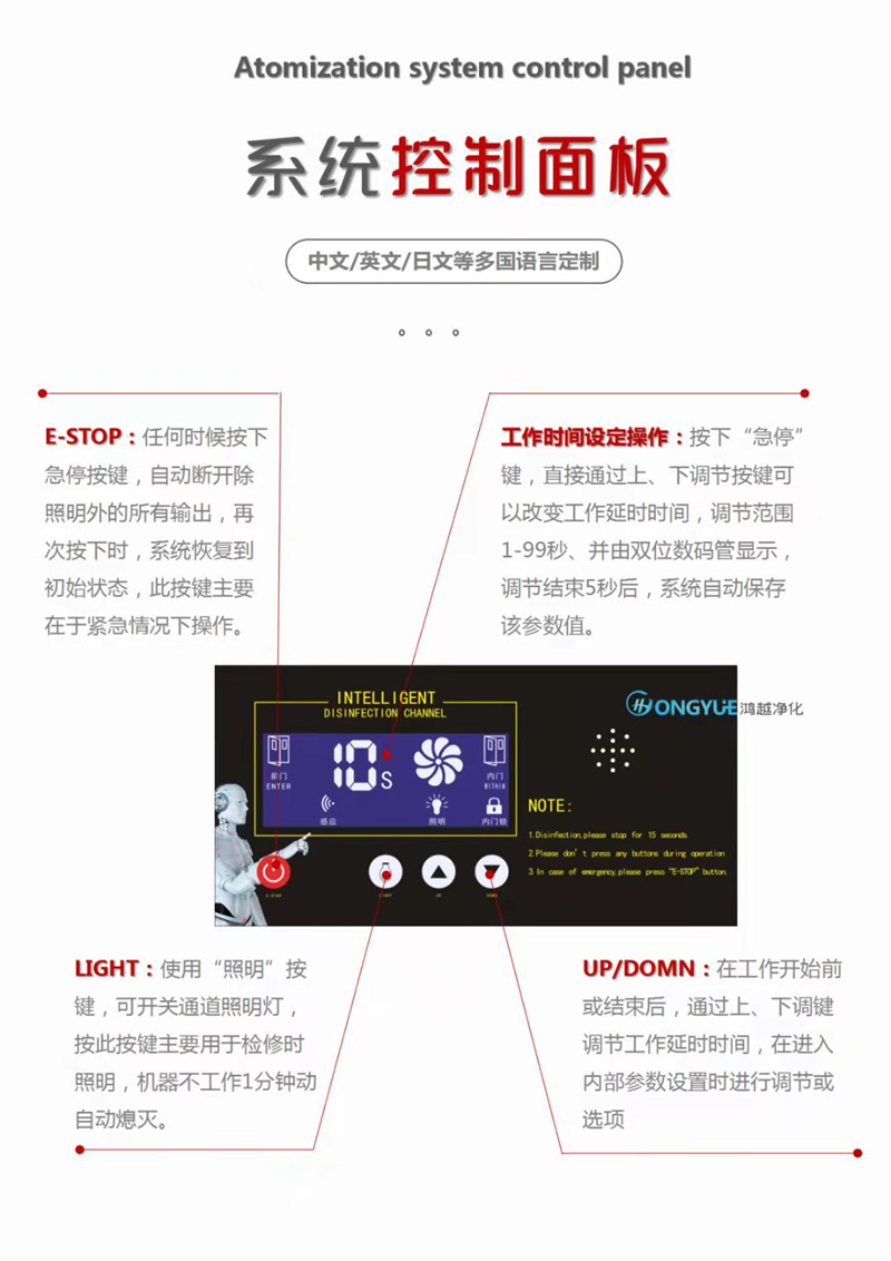 12、霧化系統(tǒng):通過霧化板將消毒液霧化成1-10微米的消毒顆粒,快速地附著于人體或物體表面,從而消滅病毒,可有效預防新型冠狀病毒的傳染;