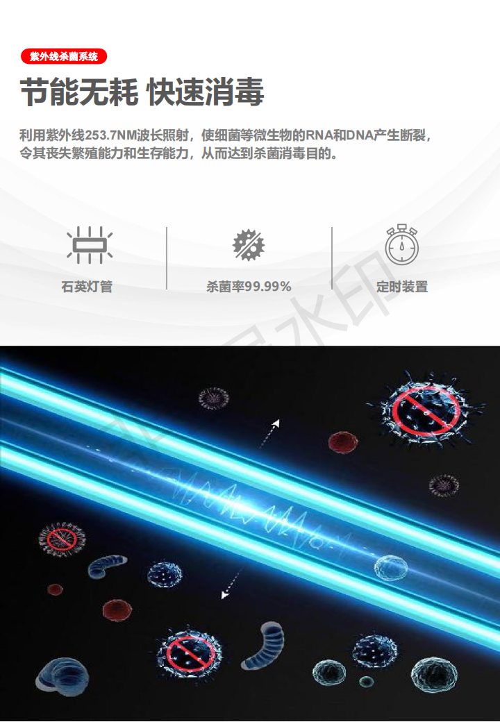 3.消毒系統(tǒng):醫(yī)用級(jí)UVC紫外殺菌燈,采用253.7nm波長(zhǎng)的紫外線,全方位照射,確保無(wú)死角殺菌。