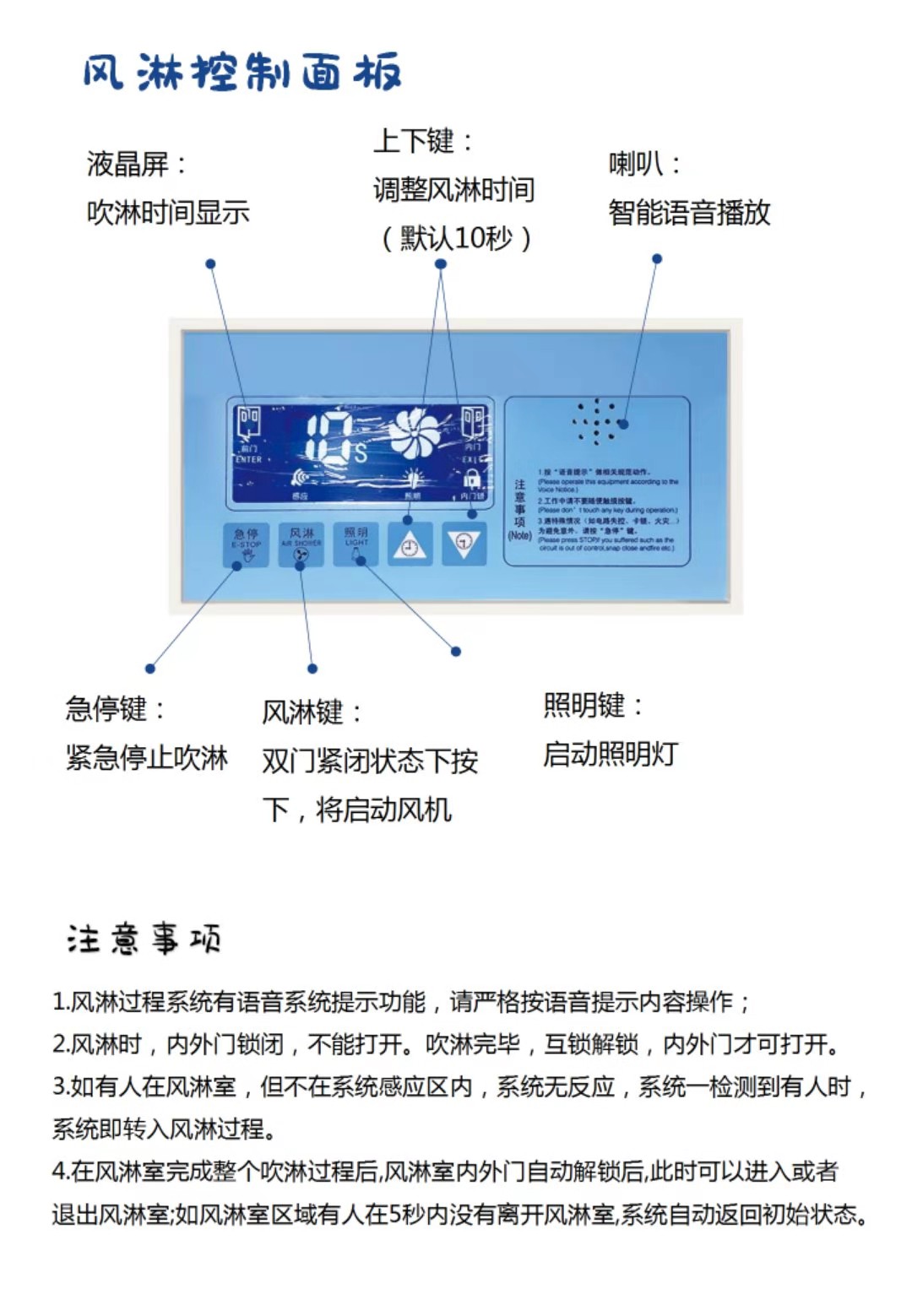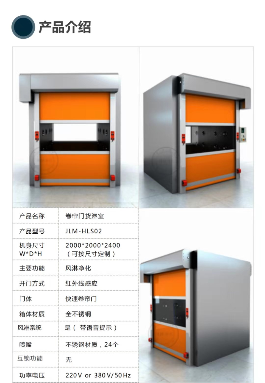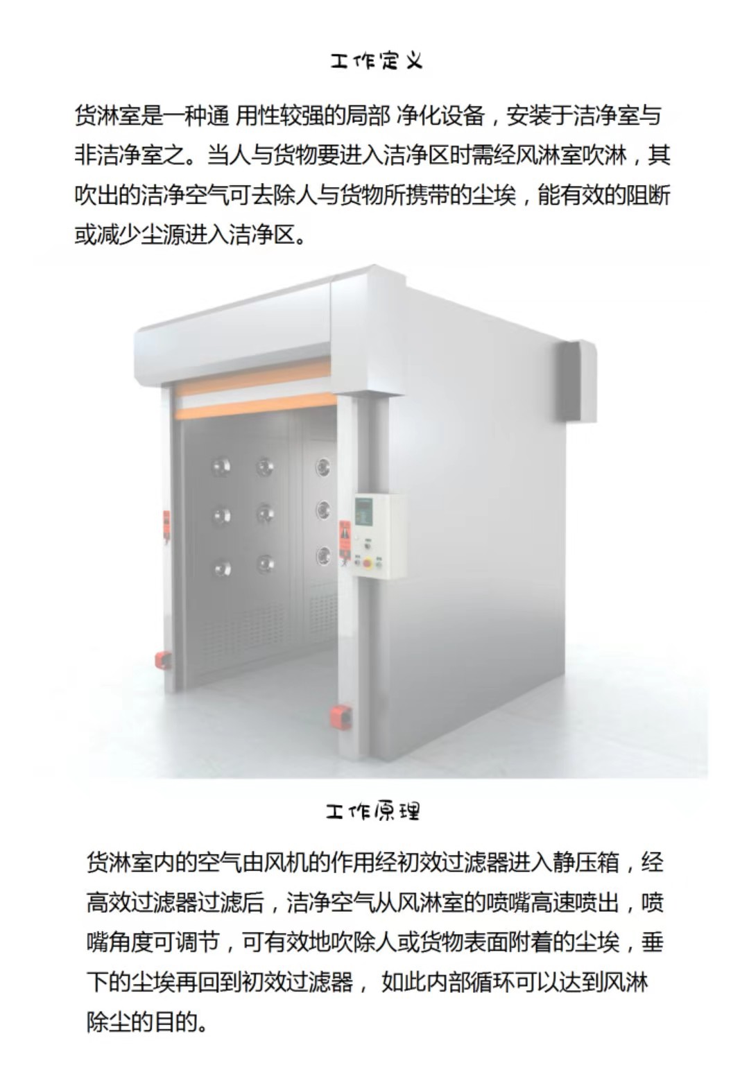 卷簾門貨淋室由風(fēng)淋室大箱體(風(fēng)機(jī)、過濾器安裝于此箱體內(nèi))、小箱體(雙吹風(fēng)淋室此側(cè)安裝噴嘴,數(shù)量與大箱體一致、頂板(安裝內(nèi)嵌式照明燈)、內(nèi)底板(不銹鋼砂板)、風(fēng)淋室雙門體與其它配件:過濾器,風(fēng)機(jī),智能電路板,噴嘴,照明燈、自動(dòng)門裝置、PVC卷簾門、卷簾門電機(jī)、光感、電箱等組成。