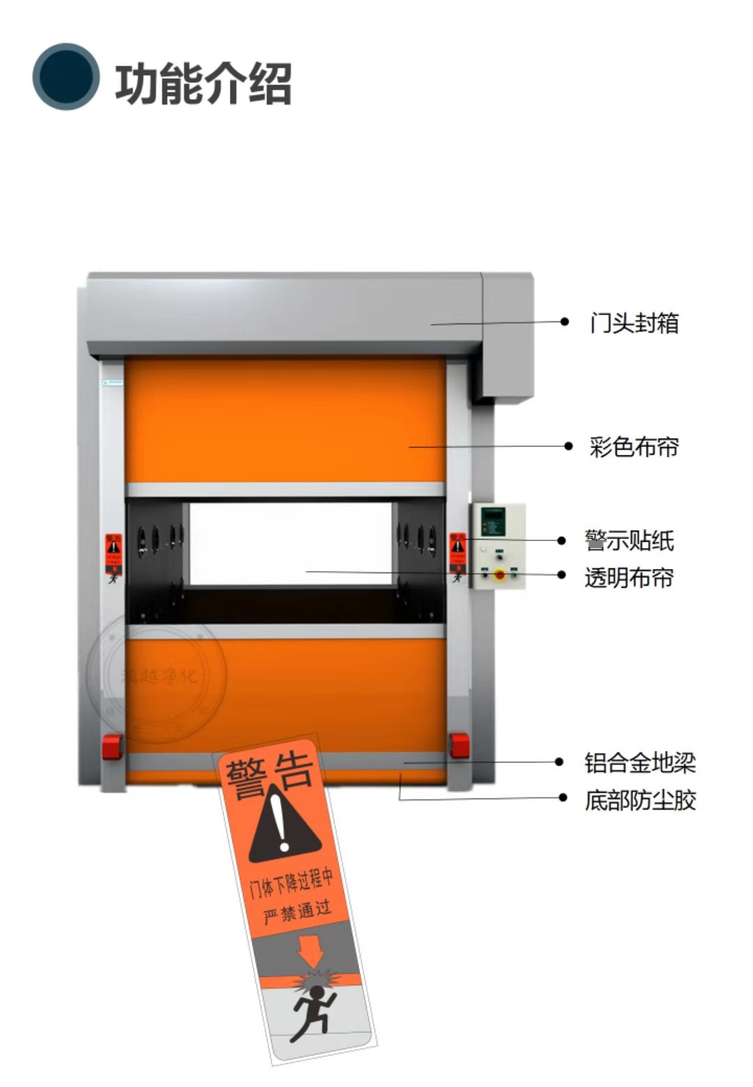 A、PVC自動(dòng)卷簾門配高強(qiáng)度抗氧化鋁合金門框、冷扎鋼板靜電噴涂電機(jī)門罩與門框。