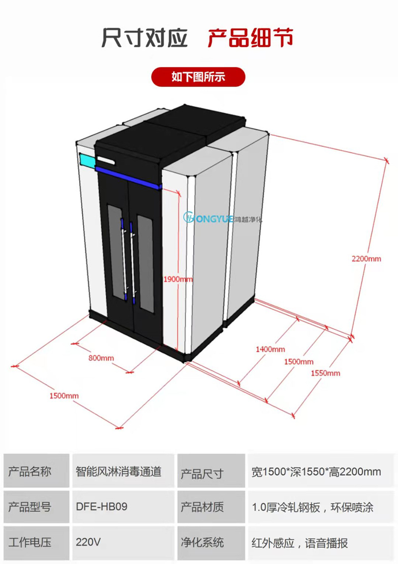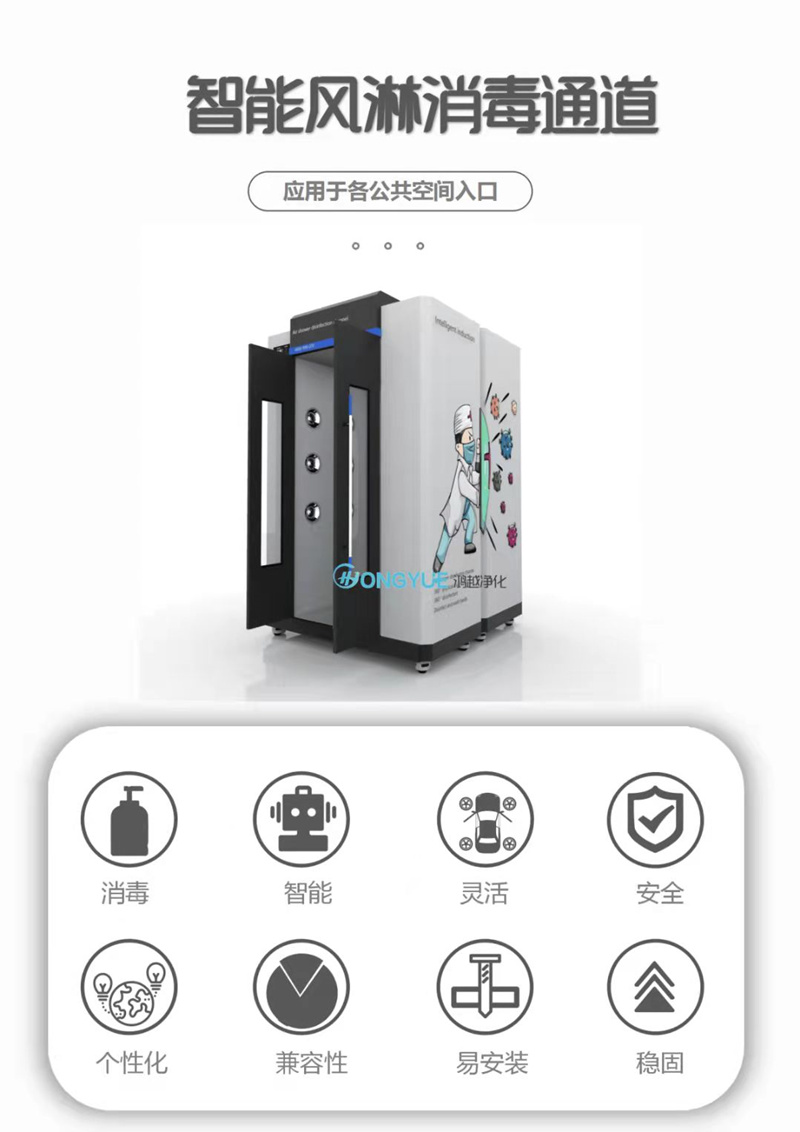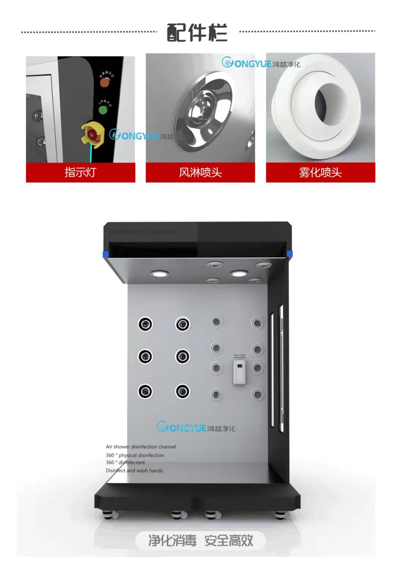 4、風淋系統(tǒng):風淋將人或物體表面的塵埃吹落,通過空氣過濾器內(nèi)部循環(huán)凈化;